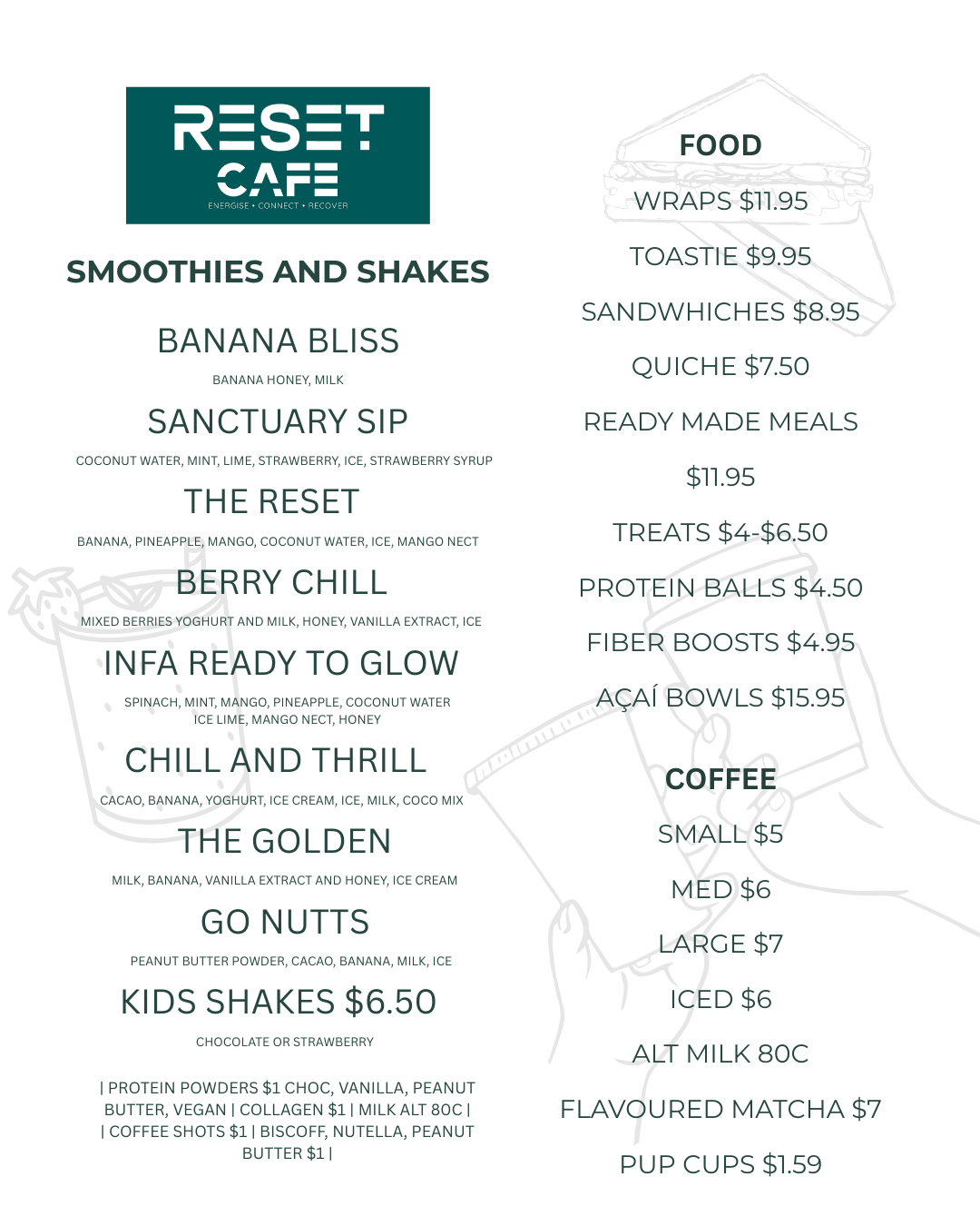 At Reset Café, we believe what you drink is just as important as what you eat. From our expertly brewed coffee to our nutrient-packed shakes and refreshing açaí bowls, every sip and spoonful is designed to fuel your body and lift your spirit. Pair that with wholesome food options crafted for balance and vitality, and you’ll find the perfect blend of nourishment and community in every visit. Come reset your day — mind, body, and soul.