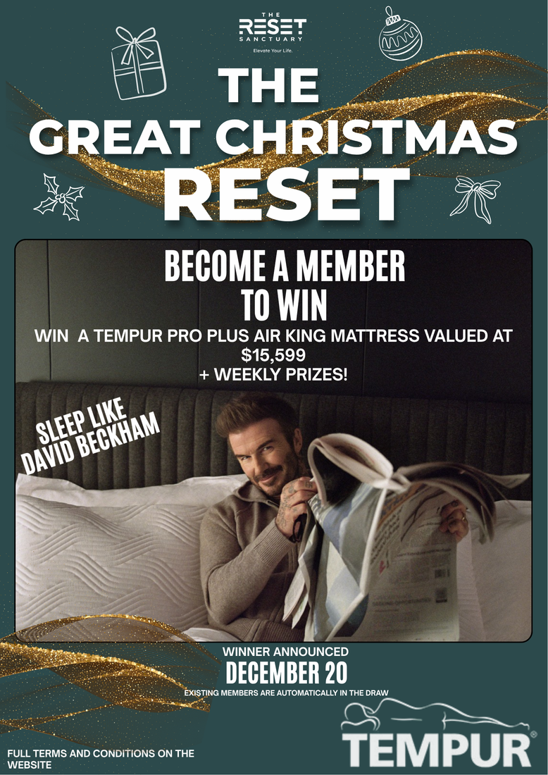 Become a member and you could sleep like David Beckham on a TEMPUR Pro Plus Air King Mattress valued at $15,599, plus go in the draw for weekly prizes and giveaways inside the Reset Sanctuary.